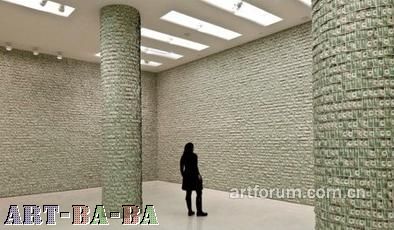 费尔德曼是2010年Hugo Boss奖得主,从而取得了2011年在古根海姆举办展览的资格,也获得十万美元的奖金,他将自己的奖金用于了更为普通的作品的创作。十万美元分成一块钱的钞票,整整齐齐地交叠着覆盖住了展厅的整个墙面。这番原原本本甚至是有些书生气的举动,产生了一种意想不到的忧郁效果,也在美学上构成了具有诱惑力的体验。